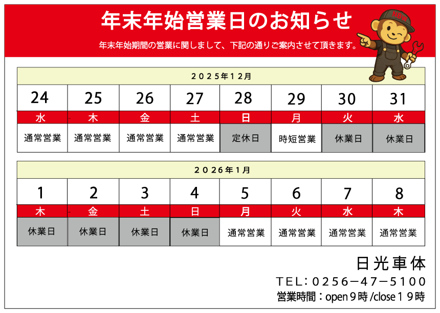 今日は年末年始の営業日をお知らせいたします(*´ω`)